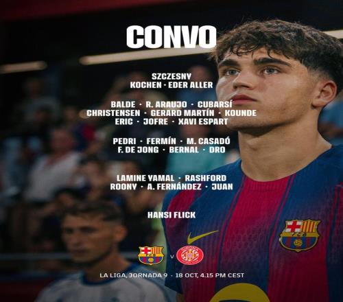 | 雷速体育10月18日讯 巴塞罗那俱乐部官方公布了本轮西甲主场对阵赫罗纳的球员名单,亚马尔和费尔明榜上有名、复出在即。 巴萨本轮球员名单 门将:什琴斯尼、科亨、埃德尔·阿勒 后卫:巴尔德、罗纳德·阿劳霍、库巴西、克里斯滕森、杰拉德·马丁、孔德、埃里克、霍弗雷、哈维·埃斯帕特 中场:佩德里、费尔明、卡萨多、德容、伯纳尔、德罗·费尔南德斯 前锋:亚马尔、拉什福德、巴尔德吉、A·费尔南德斯、胡安·埃尔南德斯 |