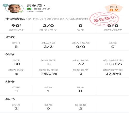 安东尼全场数据:2次射正2粒进球,赛后评分全场最高