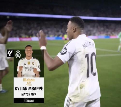 | 西甲第10轮国家德比,皇家马德里主场2-1击败巴塞罗那,此役打入一球的姆巴佩当选西甲官方全场最佳球员。