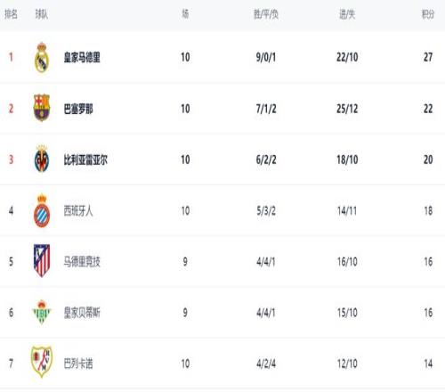 皇马击败巴萨改变了争冠格局。在积分榜上,皇马扩大了领先优势,27分领跑,领先第2名的巴萨5分,占据了夺冠主动权。比利亚雷亚尔以20分排名第3。第4的是西班牙人,拿到18分。马竞4胜4平1负,只拿到16分,排名第5。皇家贝蒂斯也是16个积分,排名第6。 |