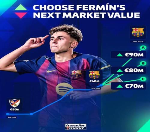 | 北京时间11月30日,德转预热了巴塞罗那中场球星费尔明-洛佩斯的身价更新,他们给出的三个选项全都为上涨,最高升至9000万欧元。