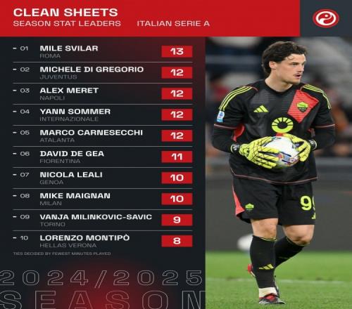 本赛季意甲零封榜:斯维拉尔13次居首,索默12次&德赫亚11次