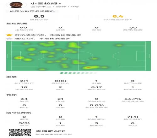 图拉姆本场数据:对抗成功7次全场最多,错失1次机会&获评6.5分