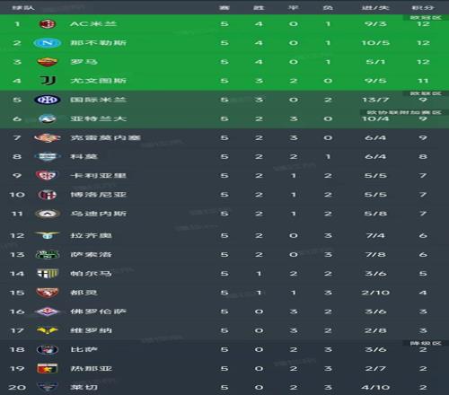 北京时间9月30日,意甲第5轮结束了所有比赛,最新积分榜如下!
