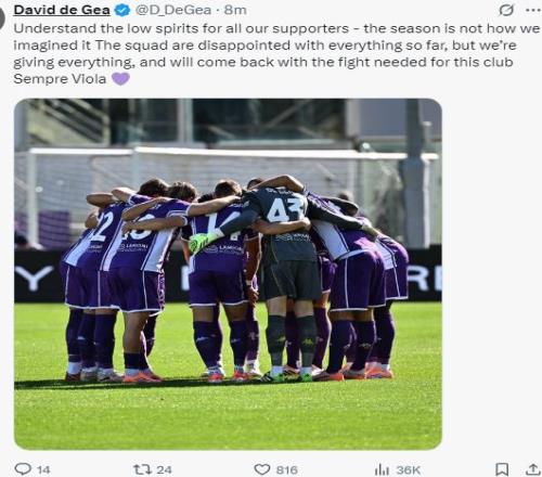 雷速体育10月6日讯 意甲第6轮,佛罗伦萨主场以1-2遭罗马逆转。在前6轮的比赛里,佛罗伦萨仅取得3平3负的战绩,迄今仍然没有取得过胜绩。比赛结束后,佛罗伦萨门将德赫亚在社媒发文,谈到球队的低迷态势。 德赫亚发文谈到时表示:“我很理解球迷们的情绪低落,这个赛季并没有如我们预想的那般,球队对目前为止的表现感到失望。但我们会拼尽全力,带着球队所需要的斗志重新归来。 |
