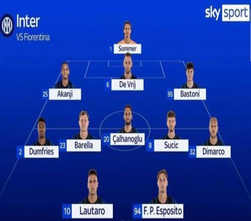 意天空国米vs佛罗伦萨首发预测: 索默;阿坎吉、德弗赖、巴斯托尼;邓弗里斯、巴雷拉、恰尔汗奥卢、苏契奇、迪马尔科;劳塔罗、皮奥-埃斯波西托 |