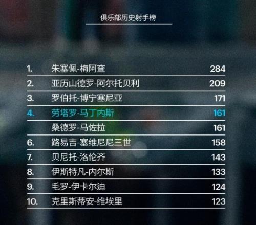 本场比赛的进球,也让劳塔罗的蓝黑军团生涯进球总数来到161球,国米队长与蓝黑名宿马佐拉一起,目前并列位居国米队史第四射手的宝座。这位阿根廷射手,正用一个个进球,一步步将自己铸就成为俱乐部的活传奇。