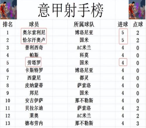 射手榜方面,意甲本赛季的射手是集体提米,奥尔索利尼和恰尔汗奥卢今天都没有进球,打入5球的他们就还能守住榜首位置,四大联赛也就只有意甲没有射手进球上双。劳塔罗,邦尼破门,追上普利西奇,莱奥,德布劳内等人,4球并列第3。 |