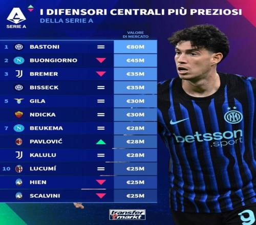 | 北京时间12月24日,在更新了意甲球员的身价之后,德转列出了目前意甲身价最高的10名中后卫,巴斯托尼8000万欧元断档第一,布翁焦尔诺4500万欧元第二,布雷默和比塞克3500万欧元并列第三。