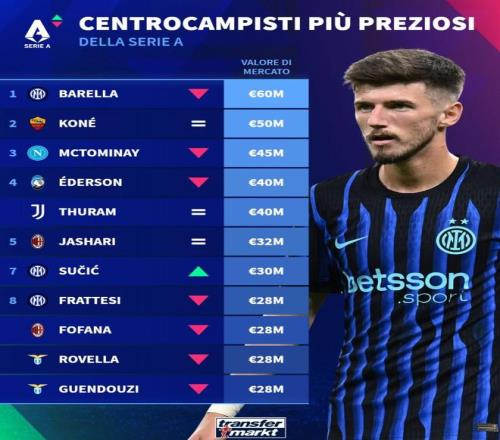 | 北京时间12月27日,德转列出了球员身价更新之后,意甲中场身价TOP10,巴雷拉6000万欧元排名第一,夸迪奥-科内5000万欧元第二,麦克托米奈4500万欧元第三。