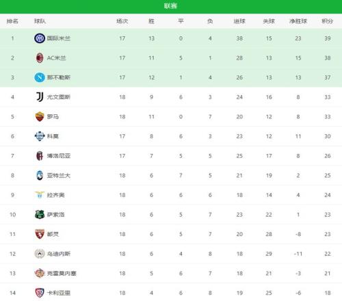 随着本轮多场比赛结束,意甲积分榜呈现出清晰的三层结构:米兰双雄依旧领跑,那不勒斯紧追不舍,欧战区与保级区的竞争则愈发残酷。 |