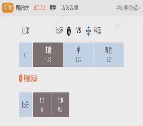大因扎吉上赛季带领比萨拿到意乙亚军升级成功,但随后大因扎吉又去了意乙球队巴勒莫执教,比萨则找了吉拉迪诺担任球队的新帅,吉拉迪诺上赛季在热那亚只带了12轮就下课,其执教能力有待商榷,本赛季本赛季18轮联赛带领比萨只拿到一场胜利,目前1胜9平8负的战绩排名倒数第二,身处降级区内,已经落后安全区3分,保级压力不小; 上一轮联赛比萨客场1-1客场战平了保级对手热那亚,连续七场不胜,状态低迷,同时本赛季球队拿到了9场平局,是意甲平局最多的球队,主要原因是进攻乏力,赛季至今只打进13球,是意甲主场进攻能力最差的球队; 科莫是上赛季的升班马,在上赛季意甲中阿飞就多次提到这个队,虽然是新军,主帅法布雷加斯执教经验也有限,但俱乐部老板是印尼华裔的黄氏家族,是意大利俱乐部的首富,上赛季通过不断买入实力球星,最终排名联赛第十,表现亮眼;新赛季球队更换了引援思路,不再执着购买大龄球星,反而买入大量青年小将,大幅度提升了科莫的阵容厚度和实力,球队目前8胜6平3负高居联赛第六,只比欧冠资格区第四名的尤文少三分; 上一轮联赛科莫主场1-0力克乌迪内斯,迎来连胜,一扫此前连续两场输球的阴霾,并且连续两场比赛没有丢球,球队也是意甲本赛季零封对手最多的球队,防守端表现稳定; 初始科莫客让0.75高位起步,后市客队继续拉升;两队本赛季成绩差距较大,但给到客场0.75的让步未免有些托大,毕竟老牌劲旅尤文在客场也只让一球,虽然科莫最近两个赛季实力提升明显且本场前场核心帕斯复出,但比萨不败率不错且保级战意具备,意味夸大客队优势并一路走高添利的动作并不合理,欧洲方面,目前平局也处于3.45的相对低位,因此综合考虑,本场看好比萨主场爆冷不败。