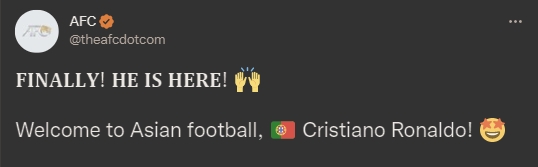 他来了!亚足联欢迎C罗:终于来了!欢迎来到亚洲足球,C罗
