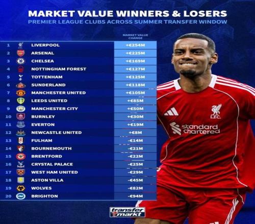 英超夏窗身价变化:利物浦+2.54亿阿森纳+2.25亿切尔西+1.69亿