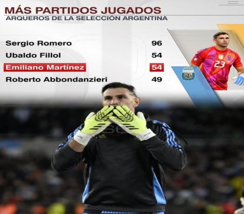 直播吧9月5日讯 阿根廷对阵委内瑞拉的南美世预赛,马丁内斯担任阿根廷首发门将。 据ESPN统计,大马丁已为阿根廷出战54场比赛,追平菲洛尔并列队史门将出场第二多,而罗梅罗出场96次队史门将最多。 此前为阿根廷出战的53场比赛,大马丁仅丢23球。 独家看英超就在咪咕 |