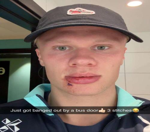 | 正在国家队集训的哈兰德在社交媒体晒照,表示自己的下嘴唇被车门夹伤,缝了三针。