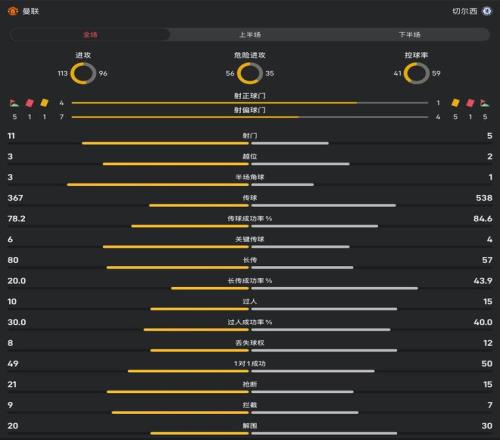 曼联vs切尔西全场数据:射门115,控球率41%59%