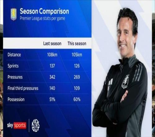 直播吧9月28日讯 本赛季英超,维拉0胜3平2负积3分,位居联赛第18位。日前,《天空体育》统计了维拉本赛季与上赛季的联赛场均数据。 跑动距离:本赛季108公里,上赛季105公里 冲刺次数:本赛季137次,上赛季126次 压迫次数:本赛季342次,上赛季269次 进攻三区压迫次数:本赛季140次,上赛季109次 控球率:本赛季51%,上赛季60% 独家看英超就在咪咕 |