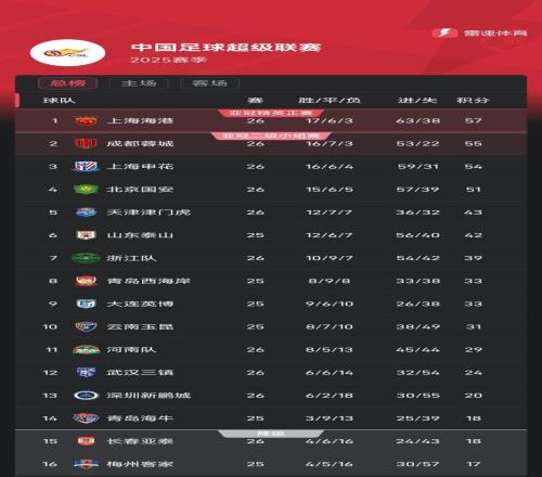 中超最新积分榜:海港头名,津门虎升至第5,梅州垫底