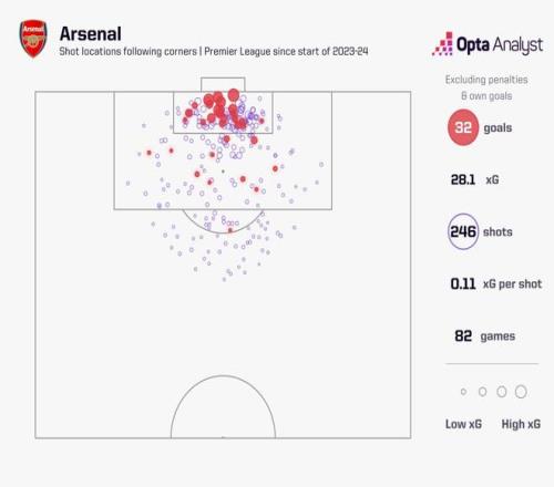 Opta揭秘阿森纳角球:前后点均衡落位,49%角球直袭球门中路