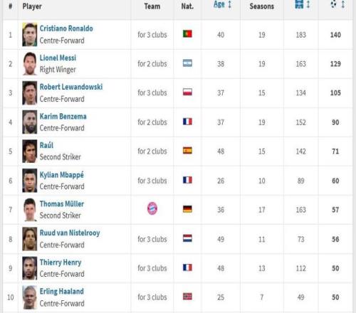 哈兰德欧冠客场进球占比32%,历史射手榜前十中仅劳尔更低
