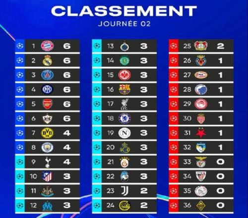 10月2日凌晨,多场欧冠比赛同时进行。至此,欧冠联赛阶段的2轮比赛全部结束。最新的积分榜上,几家欢喜几家愁。拜仁皇马等6队2连胜,而巴萨和利物浦则只有3分,药厂则位于淘汰区。 前2轮,拜仁、皇马、巴黎、国米以及阿森纳这5大豪门都是豪取2连胜。其中,拜仁势头超猛,3-1击败切尔西、5-1打爆帕斯福;皇马首轮2-1小胜马赛,本轮则是5-0横扫弱旅凯拉特。 巴黎在今夜2-1绝杀了,卫冕冠军依旧实力强大。要知道,巴黎队内有多位伤员,金球先生登贝莱一直缺阵,但他们依然能在客场拿下巴萨。国米前2轮分别击败了阿贾克斯以及布拉格斯拉维亚;阿森纳先后用2-0的比分击败了毕巴以及奥林匹亚科斯。 值得一提的是,弱旅卡拉巴赫也迎来了2连胜,让人有点意外。首轮比赛,他们3-2绝杀了本菲卡。在这场比赛后,本菲卡立刻换帅,穆里尼奥上任。今日,卡拉巴赫又2-0掀翻哥本哈根。 多特、曼城、热刺这3支队伍都是1胜1平,拿到4分,排在积分榜的7-9名。今日凌晨,曼城本有望拿下胜利,但他们在第90分钟被摩纳哥绝平,瓜迪奥拉无比郁闷。 巴萨本轮被巴黎绝杀,2轮拿到1分,且净胜球为0,只能排在第16名。利物浦更悲催,今夏投资近5亿欧的红军暂时只排第17名。切尔西昨日1-0小胜本菲卡,2轮同样拿到3分,排在利物浦之后。 豪门之中,勒沃库森是最悲催的。2连平之后,药厂排在第25名,正好跌出了晋级区。目前,超级弱旅凯拉特排在倒数第1名,他们前2轮一共丢了9个球。 |