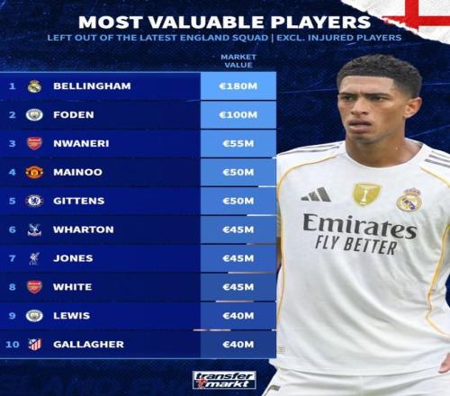 | 英格兰队公布了最新一期球队大名单,德转盘点了本次未能入选的球员身价榜(受伤球员除外)。