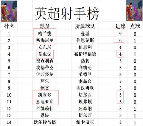 射手榜方面,哈兰德7轮打入9球,继续稳居榜首,塞梅尼奥6球排在第2,错失单刀的蒂亚戈还是和安东尼4球并列第3。恩迪亚耶,沃尔特马德今天进球后,追上凯塞多,埃基蒂克等人3球刚好挤入前十。 |