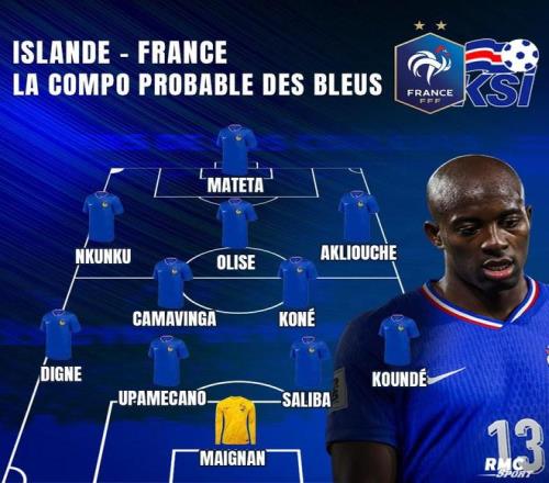 | 北京时间10月13日,RMC体育预测了世预赛法国客战冰岛的首发名单,德尚被认为会进行大幅度的轮换,马特塔和阿克利乌什有望迎来各自在法国国家队的首次首发。