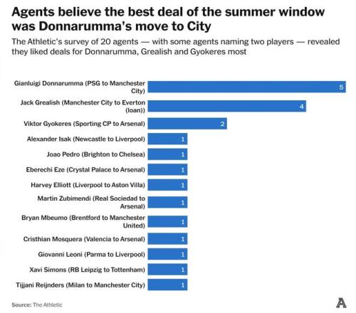 这个回答囊括了两种最受欢迎的选择,近半数的经纪人在多纳鲁马(曼城的新一号门将)和焕发活力的格拉利什(他从曼城租借至埃弗顿一个赛季,目前已贡献 4 次助攻和 1 粒进球)之间难以抉择。 “埃弗顿签下了一名在正常情况下他们根本不可能签下的球员,我认为这让他们有余地同时进行迪布林(从南安普顿以初始 3500 万英镑签下)的交易。我认为出于这个原因,这是一笔聪明的交易,”另一位经纪人解释他选择格拉利什的原因。 在多纳鲁马方面,是他的才华、年龄和转会费的结合使他获得了最多的投票。 “其他位置花了那么多钱,但我仍然认为守门员的价值被低估了,”一位经纪人说。“我认为多纳鲁马是世界上最好的守门员之一,如果不是最好的话。所以,仅仅因为巴黎圣日耳曼想踢不同风格的足球,就能以‘白菜价’得到他,这是非常令人印象深刻的。” “他的脚下技术可能不是最好的,”另一位经纪人补充道,“但他是世界上最好的扑救手,而这可能正是曼城所需要的。” 此外,还有唯一获得超过一票的球员是哲凯赖什,他被两位经纪人描述为一名能给阿森纳带来“他们一直缺少的东西”的前锋。 此外,还有人提到了埃泽(“在这支阿森纳队中,他会非常出色”)、哈维-西蒙斯(“一个成功的赛季后,他将价值连城”)、若昂-佩德罗(“考虑到他的年龄以及其他前锋的转会费,这很超值”)和伊萨克(“他将改变利物浦的进攻多年,并有助于替代萨拉赫”)等。