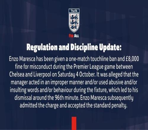 | 北京时间10月15日,英足总官方发布公告,公布了对马雷斯卡的处罚措施,后者在对阵利物浦的比赛中被红牌罚出场外。