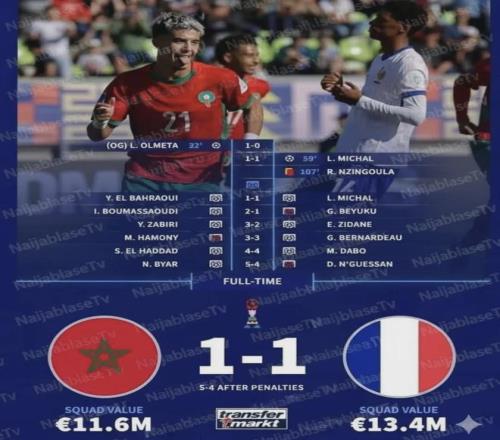 摩洛哥5-4 法国 第一场半决赛是由摩洛哥对阵法国,两队在120分钟内战成1-1平手,进入残酷的点球大战。 点球大战双方前5轮战成4-4。第6轮,法国队恩盖桑点球被梅斯巴希扑出,摩洛哥队点球5-4取得胜利,晋级U20世界杯决赛!