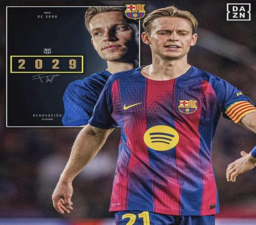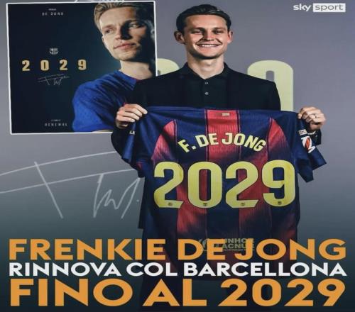 巴萨官方公告: “德容将长期身披巴萨战袍。今天,这位中场球员与巴塞罗那足球俱乐部签署了新合同,合同有效期至2029年。德容与俱乐部主席拉波尔塔共同出席了在俱乐部总部举行的签约仪式。”