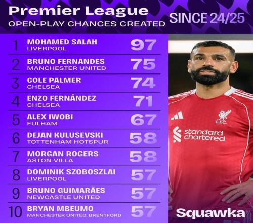 | 据数据网站Squawka统计,自2024-25赛季以来,萨拉赫是英超运动战创造机会次数最多的球员,布鲁诺-费尔南德斯排名第二。