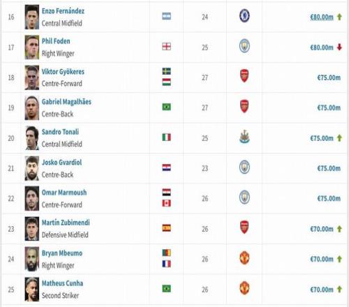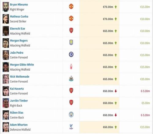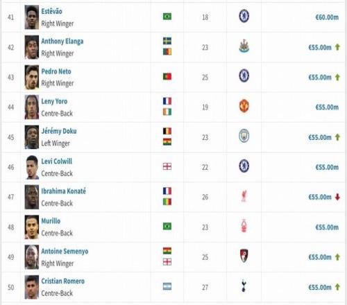 英超身价变更:维尔茨降至1.3亿欧,萨卡降至1.4亿欧,凯塞多升至1亿欧