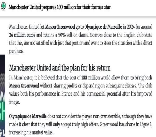 格林伍德从曼联3160万欧元加盟马赛后,至今在法甲打入27球,成为自格伦·霍德尔之后法甲进球最多的英国球员,霍德尔在1987年至1991年期间效力于摩纳哥队,也打入了同样的进球,青木超越他只是时间问题。 青木的进球各式各样,包括一记右脚点球、一记左脚内切射门、一记对抗中快速起脚和一记抢点得分。「我高兴得快疯了。」他赛后与另一位曼联青训旧将阿吉尔·戈麦斯一起竖起四根手指说,「我以前从未上演过帽子戏法,所以打入四球感觉太棒了。」 西班牙「Fichajes转会网」很快曝料称,曼联准备豪掷1亿欧元(8680万英镑)向马赛回购格林伍德。据其所言,曼联出售青木的合同中有50%的转售条款,但俱乐部不满足于只分成,希望重新拥有这位天才前锋。