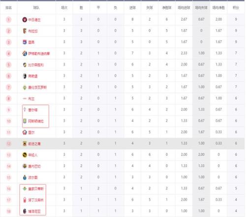 积分榜方面,随着维拉、罗马爆冷输球,贝蒂斯也无力赢球,本轮过后英超、西甲和意甲竟无一队能挤入前8,法甲和德甲则是各有一队进前8,里昂3连胜排在第3,弗赖堡2胜1平排在第6。中日德兰3连胜,1个净胜球优势力压布拉加和里昂领跑。惨遭逆转的维拉2连胜被终止,排名跌到第10,排在塞尔塔之后。贝蒂斯第16,诺丁汉森林第17,意甲两强更惨,博洛尼亚排在第18,罗马第23。