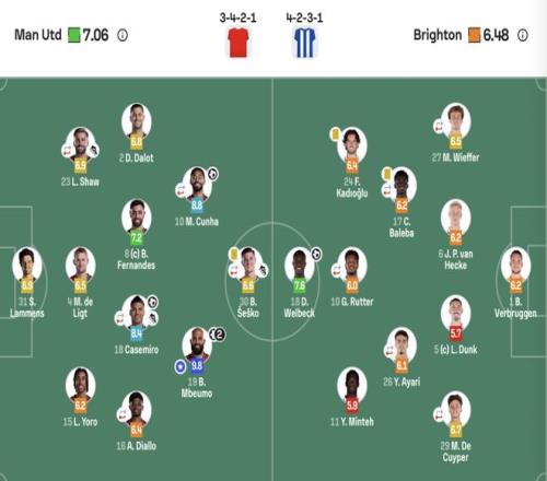 曼联(3421):31-拉门斯;15-约罗,4-德里赫特,23-卢克肖(65‘26-海文);16-迪亚洛(70‘13-多古),18-卡塞米罗(70‘37-梅努),8-B费,2-达洛特;19-姆伯莫,10-库尼亚(81‘25-乌加特);30-谢什科(82‘11-齐尔克泽)