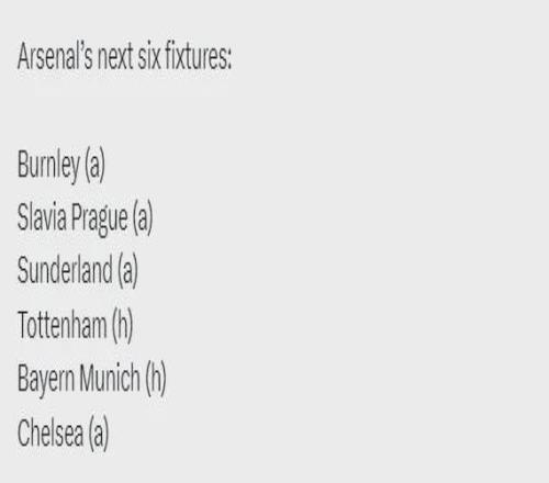 阿森纳未来6场比赛:客战伯恩利,客战布拉格斯拉维亚、客战桑德兰、主战热刺、主战拜仁、客战切尔西。 接下来又是一段魔鬼赛程,先是三连客,且有桑德兰这种黑马,后面的三场比赛也没有一场轻松的。 不过相对来说,我觉得对手现在更怕碰到阿森纳,怕个球?拜仁本赛季相当强势,那就来比比谁更强吧! 希望一路碾压!当然话说回来,哪怕丢几分,也不用就此恐慌,有心理预期就好,这支球队不会轻易被击垮,保持稳定即可,不是输不起。