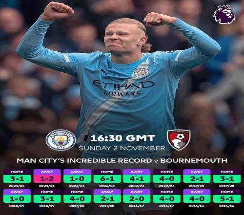 | 北京时间11月1日,英超官方预热了本周末曼城主场对阵伯恩茅斯的联赛第10轮比赛,虽然目前蓝月亮仅排名第5,而樱桃军团高居第2,但两队的历史交锋却成一边倒的趋势。