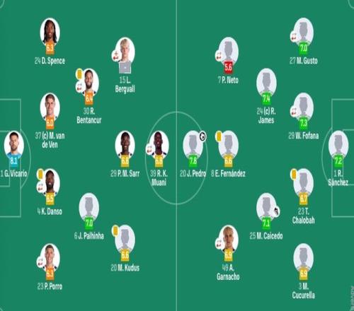 【出场阵容】 热刺首发:1-维卡里奥、4-丹索(60'17-罗梅罗)、37-范德芬、23-波罗(73'13-乌多吉)、24-斯宾塞、6-帕利尼亚、15-贝里瓦尔(7'7-哈维-西蒙斯(73'28-奥多贝尔)))、30-本坦库尔(60'9-里沙利松)、29-萨尔、20-库杜斯、39-科洛-穆阿尼(73'22-布伦南-约翰逊) 替补未出场:31-金斯基、、44-斯卡莱特、11-特尔 切尔西首发:1-桑切斯、27-古斯托(78'45-拉维亚)、29-福法纳(89'4-阿达拉比奥约)、23-查洛巴、3-库库雷利亚、24-里斯-詹姆斯、25-凯塞多、8-恩佐、7-内托(85'41-埃斯特旺)、49-加纳乔(66'43-吉滕斯)、20-若昂-佩德罗 替补未出场:12-约根森、34-阿奇姆彭、21-哈托、17-桑托斯、38-吉乌 |