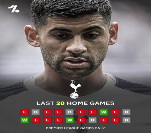 | 英超第11轮,热刺主场2-2战平曼联,至此,热刺最近20场英超只取得3场胜利。