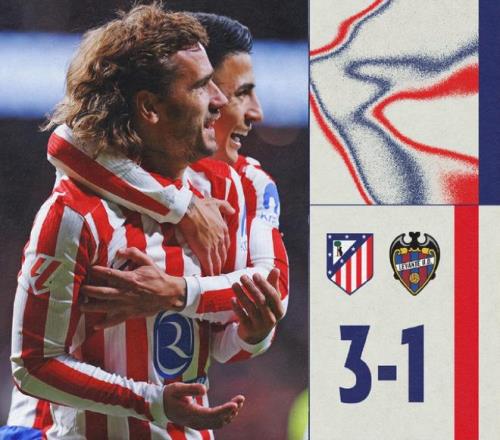 主场面对莱万特,马竞上半场开局不错,依靠一个乌龙球先下一城,随后马努-桑切斯头球破旧主,比分1-1扳平。下半场,替补出战的格列兹曼短短19分钟完成梅开二度,帮助马竞3-1再度领先,这个比分也保持到比赛结束。据统计,格列兹曼已在西甲联赛打进201球,成为历史第11人。 |