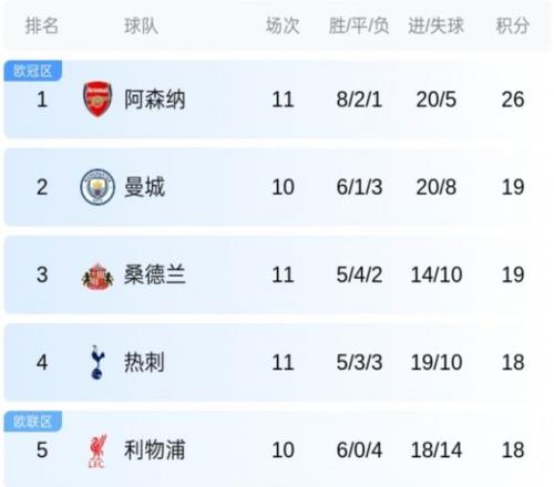 本场比赛战平后,阿森纳未来的赛程也强敌环伺。下轮联赛,他们将在主场迎战热刺,上演“北伦敦德比”,随后在欧冠中迎战拜仁。 12月的第1场比赛,阿森纳将客场对阵切尔西。 消息来源:数据记录 5 - 新赛季积分对比很激烈 英超第11轮,阿森纳客场2-2战平桑德兰。最新的积分榜方面,枪手7分优势领跑,曼城和桑德兰同积19分,曼城明日凌晨对阵利物浦。热刺、利物浦、伯恩茅斯、曼联四队同积18分。黑马本赛季打出比赛发挥实在出色。 如果曼城拿三分那么他们跟阿森纳的分差就只有4分了,如果斯洛特赢了那么就更加激烈了的。