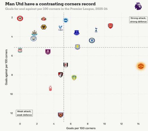 | 论进攻,曼联才是英超角球之王? 英超 11-10 18:02 曼联的定位球水平行不行?凭印象,你很可能得出“防守很差”的结论,这也是事实。但要是论进攻,红魔却正在成为英超的“角球之王”。上周末绝平热刺,曼联就是靠德利赫特顶进角球,而论数据,他们在某种意义上甚至强于阿森纳。据竞技网计算,曼联本赛季虽然实际角球破门数低于阿森纳、切尔西,获得角球的次数也偏低,但他们“每100次角球平均进球数”是14.3,位列全联盟第一,而“每100次角球的预期进球值”也达到了7.1,在整个英超可排第二。