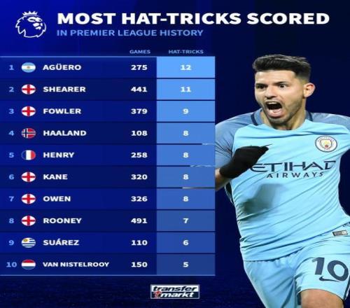 | 北京时间11月11日,德转统计出了英超历史完成帽子戏法次数最多的10名球员,阿圭罗以12次排名第一,阿兰-希勒11次第二,哈兰德8次位列第四。