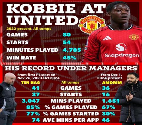 阿莫林执教之前,梅诺因伤缺席6周,但新帅到任时他已经康复。可惜,在波斯曼路球场,梅诺只能坐在替补席,阿莫林选择了老将卡塞米罗和埃里克森。可以说,从一开始,40岁的葡萄牙少帅就认为这名英格兰天才不适合自己的343战术,这跟大多数人的看法相同。 在滕哈格执教期间,从2023年11月对埃弗顿完成联赛第一次首发后,梅诺在52场曼联的比赛先发出场37次。但阿莫林执教后55场比赛,他只有16次首发。 本赛季更为明显,20岁的梅诺唯一的首发是联赛杯对英乙球队格里姆斯比,而且球队爆冷输球,在那之后,他苦等英超先发至今都没有实现。数据显示,梅诺的联赛出场时间,仅有138分钟。 滕哈格提拔的青训明星,加纳乔已经被卖了,梅诺遭到冷落,看来迟早也会离开。不过,他希望早点走人,但俱乐部却想要延迟,这很可能导致曼联新帝星最终无缘2026年的美加墨世界杯。 在2024年欧洲杯八强战、半决赛和决赛,梅诺都代表英格兰出战,包括决赛首发。他当时春风得意,向曼联提出要20万英镑周薪续约。但情况随后急转直下,梅诺上一次入选英格兰队已经是2024年9月,新帅图赫尔已经5次召集国家队,每次名单里都没有梅诺。