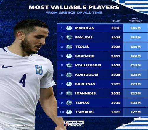 | 北京时间11月16日,德转列出了希腊历史身价排名前10的球员,2018年身价曾经达到4500万欧元的马诺拉斯高居第一,本菲卡前锋帕夫利季斯3500万欧元第二,利物浦的旧将齐米卡斯排在第十位4,布莱顿的两位新星18岁的科斯图拉斯和19岁的齐马斯上榜。