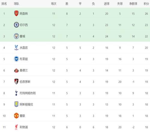 在积分榜上,阿森纳依然排名榜首,8胜2平1负,拿到26分。切尔西赢球后,总积分达到23分,排名升到第2。输球的曼城依然是22分,排名第3。第4的是水晶宫,拿到20分。布莱顿、桑德兰和伯恩茅斯都是19分。热刺、曼联和利物浦都只拿到18分。不过,热刺和曼联比利物浦少踢1场。没想到总身价高达11.5亿欧元的利物浦掉到了积分榜下半区,太奇葩了。 |