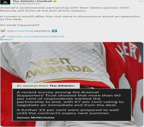 gunnerblog在TA上解释了阿森纳终止参观卢旺达袖管赞助的原因。 报道称,阿森纳从“参观卢旺达”的赞助那里获得的收益是很丰厚的,俱乐部很清楚要找到一个能匹配这一财务承诺的合作伙伴将是一件很有挑战性的任务。 但同时,阿森纳也担心负面新闻的影响,而且国际制裁也可能会危及这笔交易。 说白了还是舆论环境问题,正如之前所说,卢旺达涉及一些地缘政治和战争,虽然这和阿森纳100%没有直接关系,但多一事不如少一事,万一屎盆子扣头上,真得不偿失。 会有别的赞助商的,哪怕钱少点也没事。